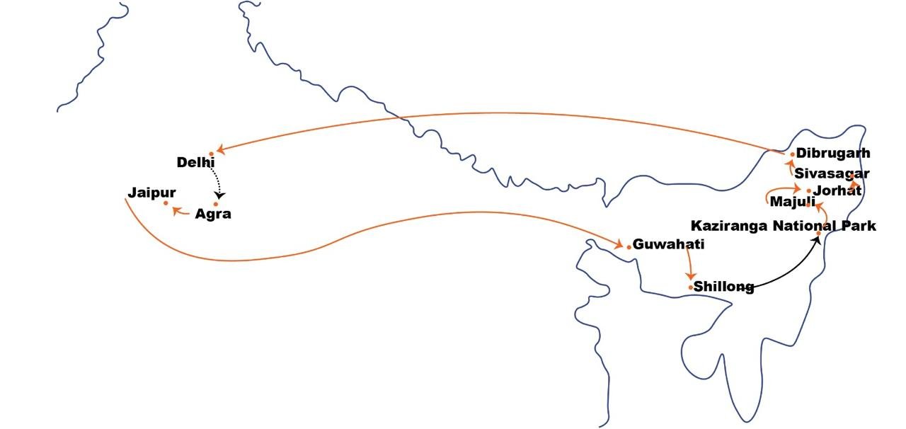 Delhi - Agra - Fatehpur Sikri - Jaipur - Guwahati - Shillong - Kaziranga National Park - Majuli - Jorhat - Sivasagar - Dibrugarh - Delhi